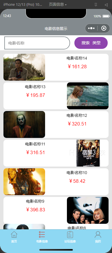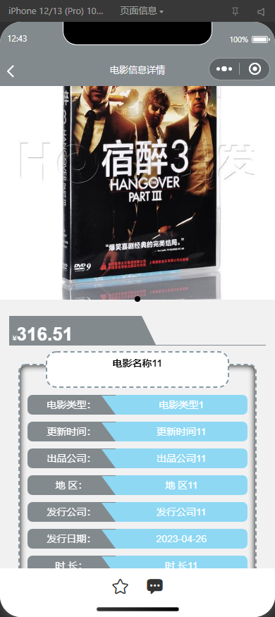 电影信息:用户可以查看电影的详细信息,包括电影名称、类型、价格、更新时间、出品公司、地区、发行公司、时长、导演、评分、点赞数和评论数等。