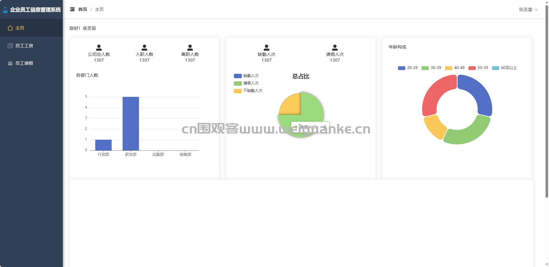 主页:员工个性化工作台,聚合待办事项与核心数据看板。