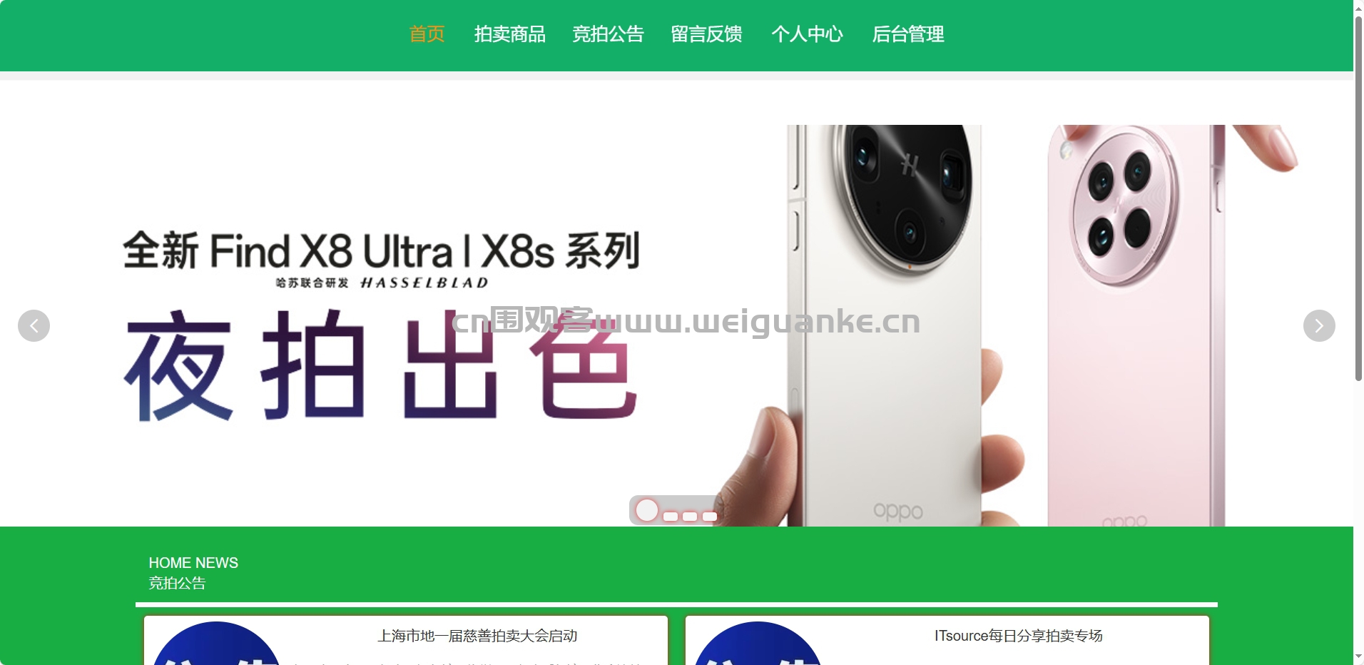 首页: 展示拍卖系统的核心信息,如热门拍卖商品、最新竞拍公告等,为用户提供导航入口。