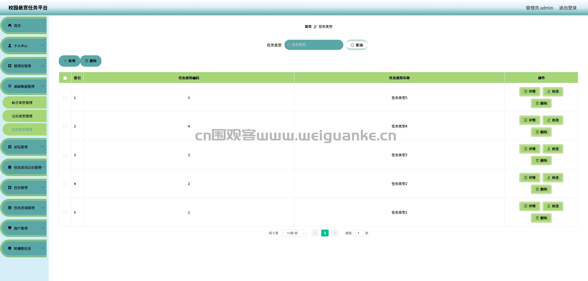 公告类型管理:可以添加、修改、删除任务资讯公告的类型