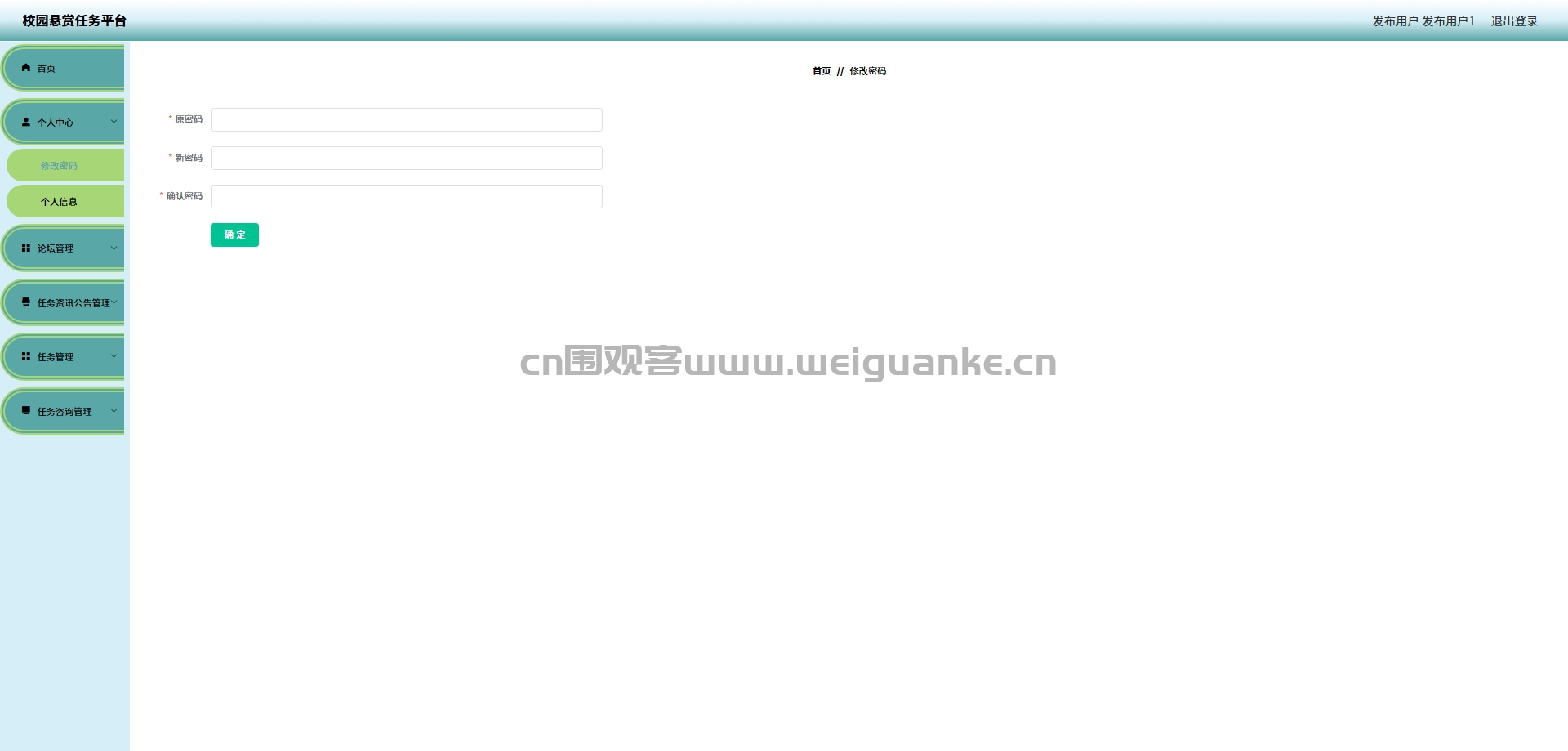 修改密码:发布用户可以在这里修改自己的登录密码