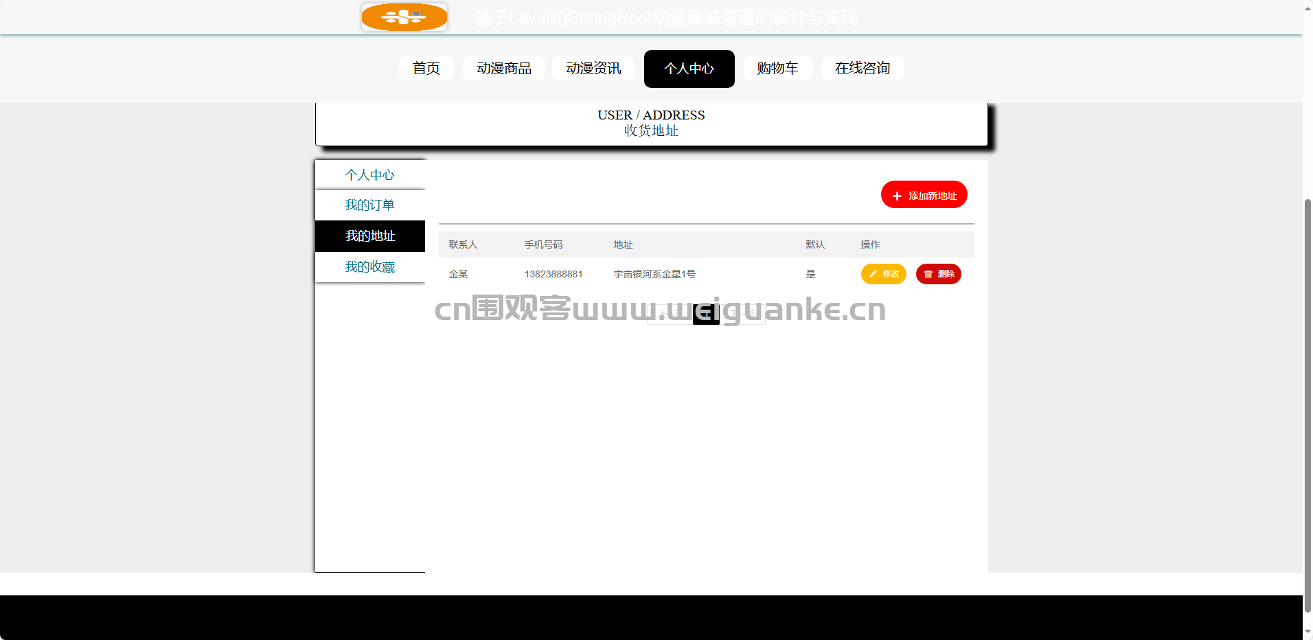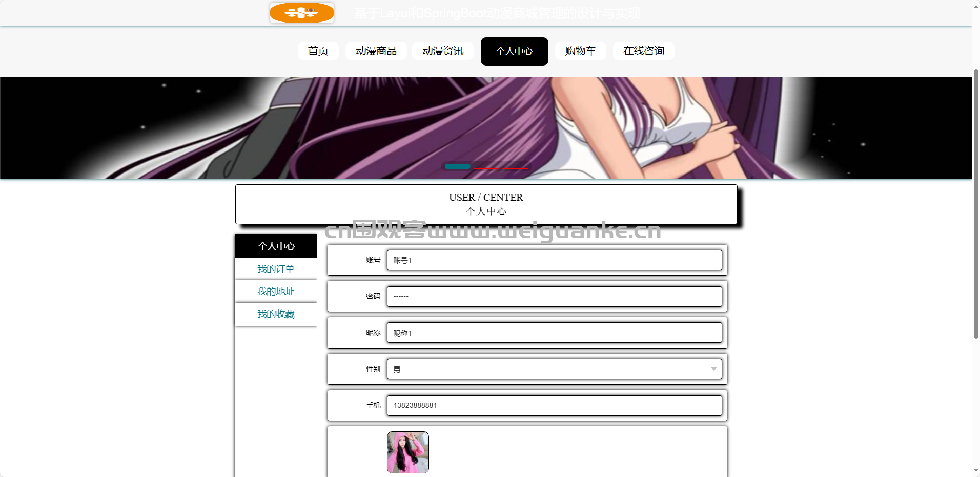 按分类浏览动漫商品,查看商品详细信息,将商品加入购物车,提交订单并选择收货地址、支付方式等。
