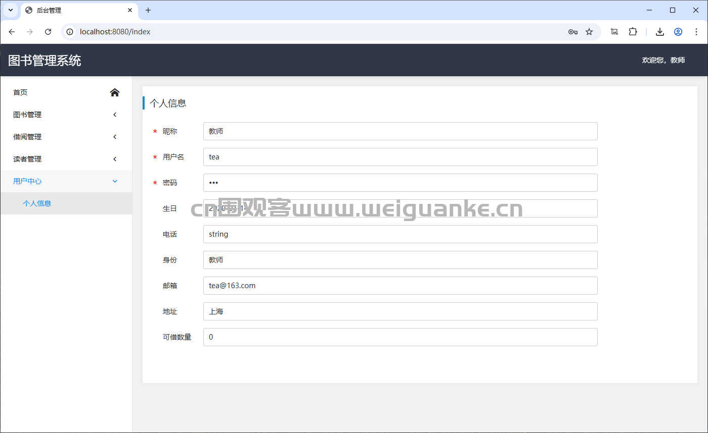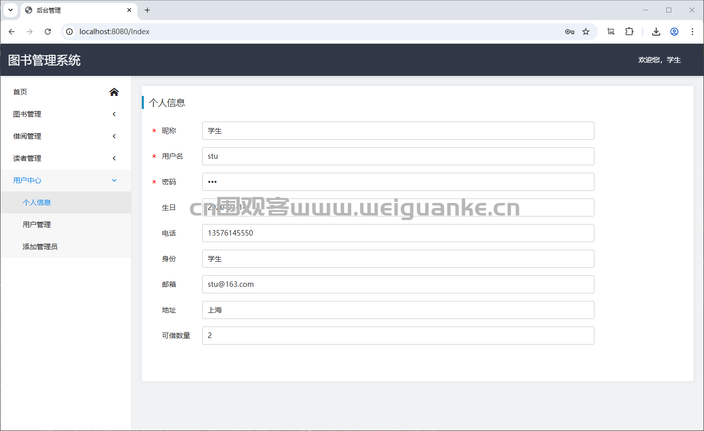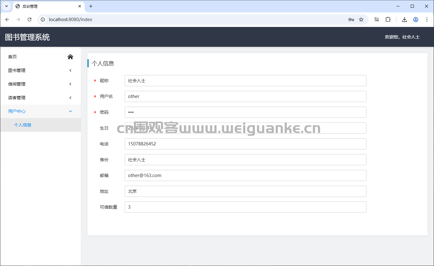查看和编辑个人信息(昵称、用户名、密码、生日、电话、邮箱、身份、地址、可借数量等)。