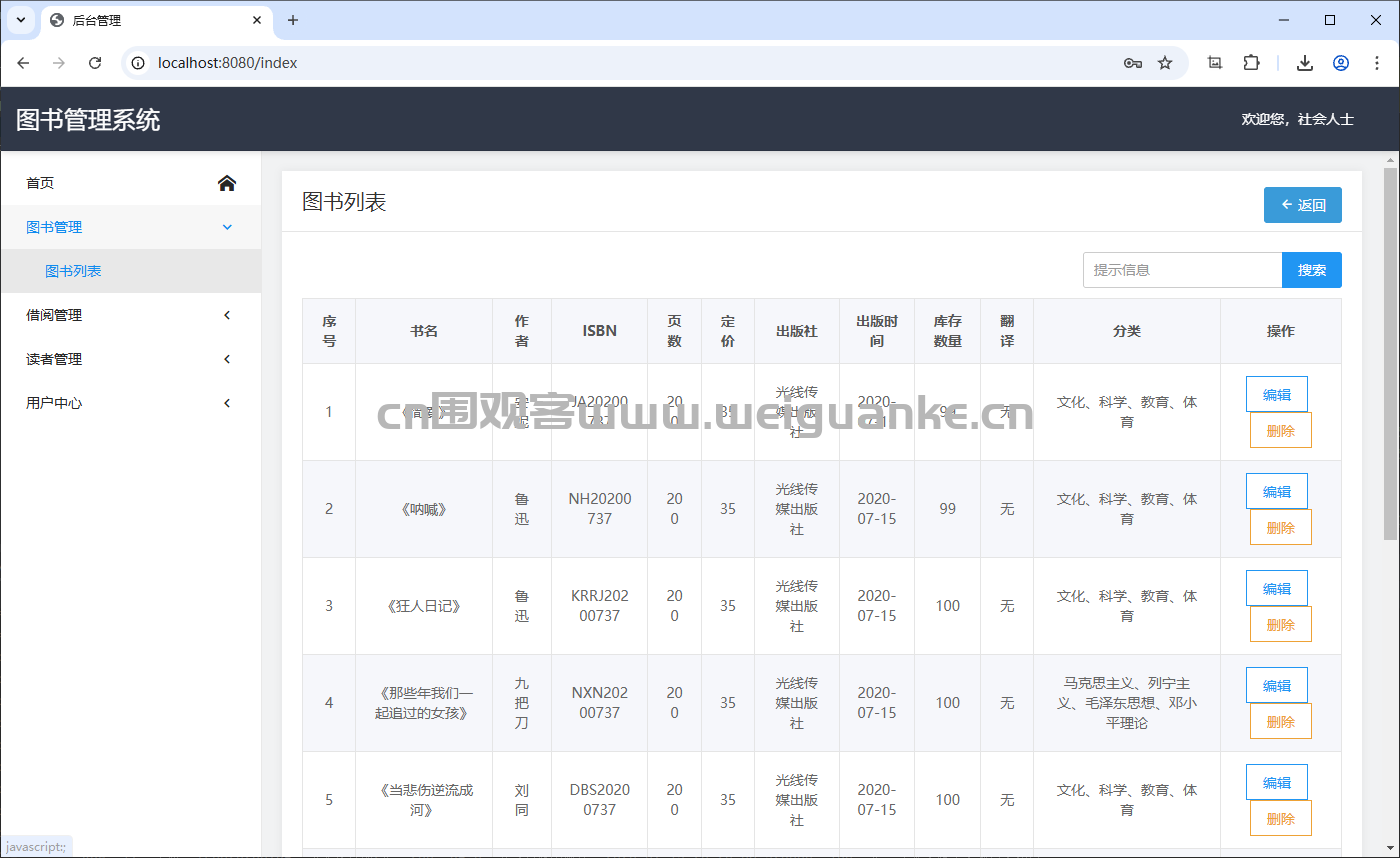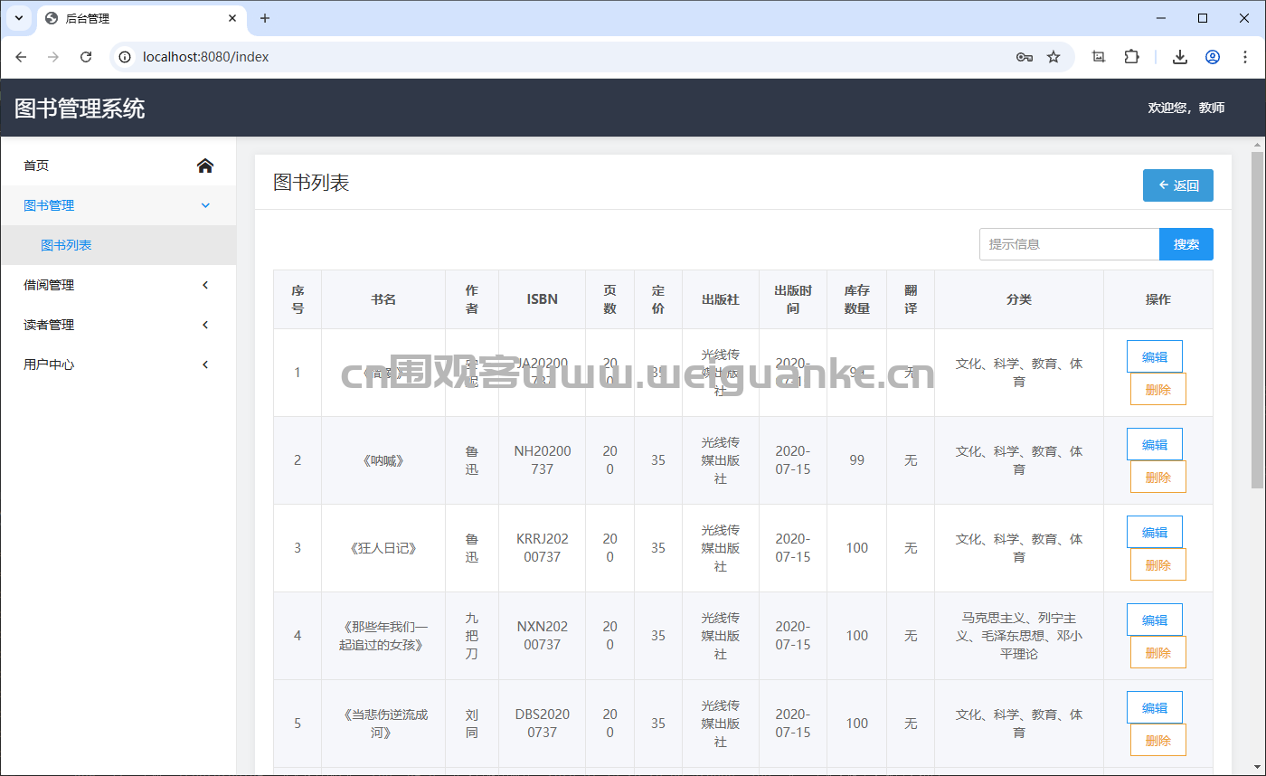 查看图书列表,包括书名、作者、ISBN、页数、定价、出版社、库存数量、分类等信息。