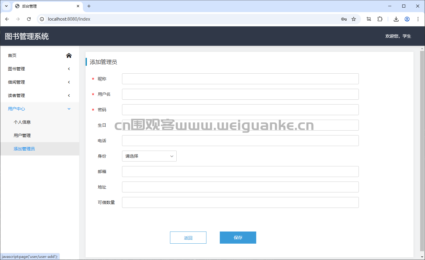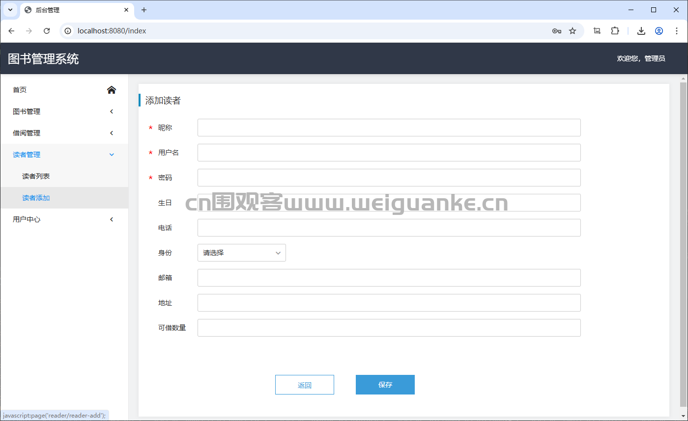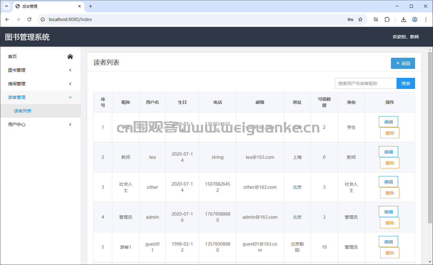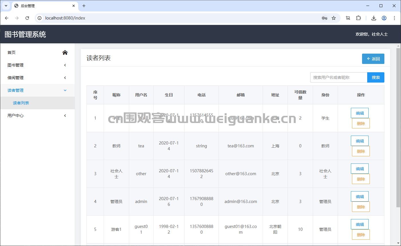 添加、编辑和删除读者信息(如学生、教师、社会人士等)。
