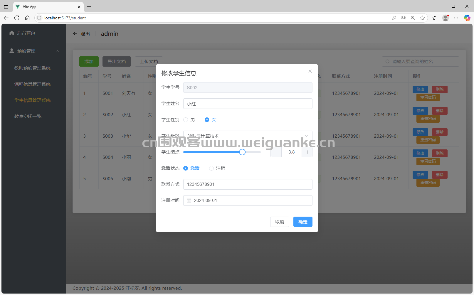 学生选课:学生可预约课程(如S003小华预约“大数据开发与应用”)。