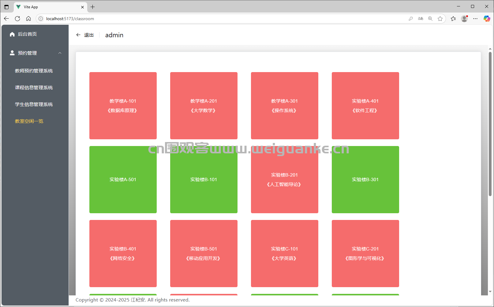 列表展示教学楼/实验楼各教室(如A-101、B-201)的占用情况。