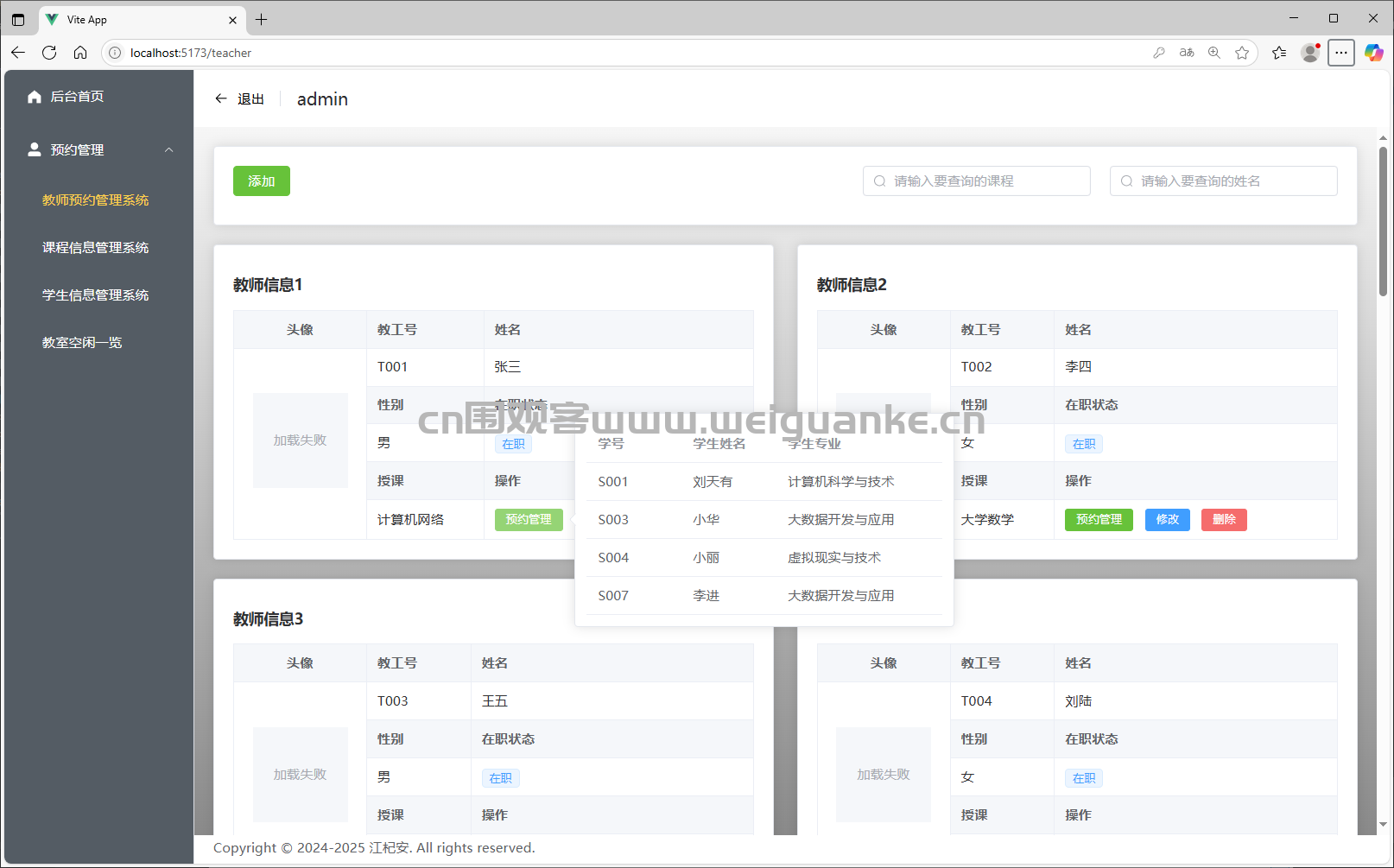 教师预约:关联教师与授课课程(如“计算机网络”由张三授课)。