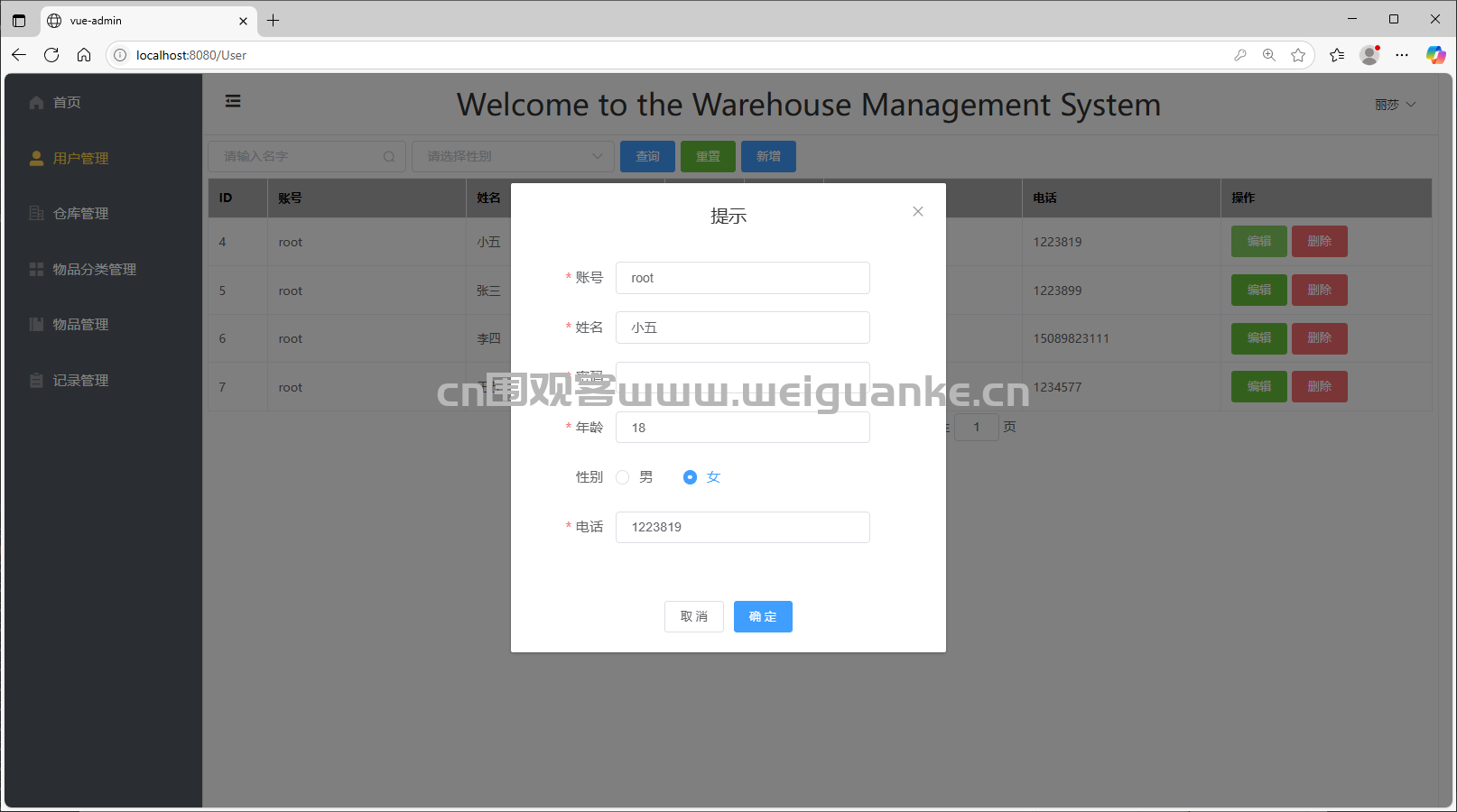 用户信息包括:账号、姓名、电话、性别、年龄、角色(管理员/普通用户)。