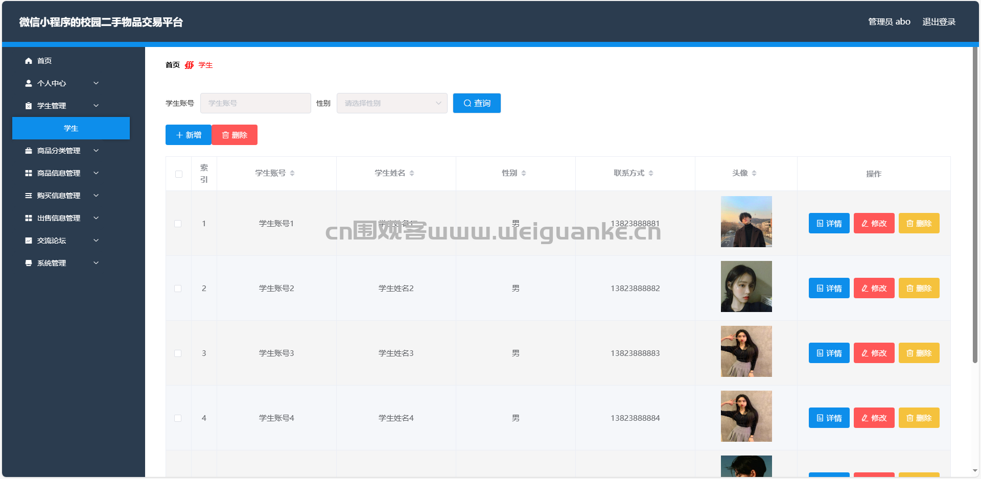 2.学生管理:查看、编辑、删除所有注册学生信息