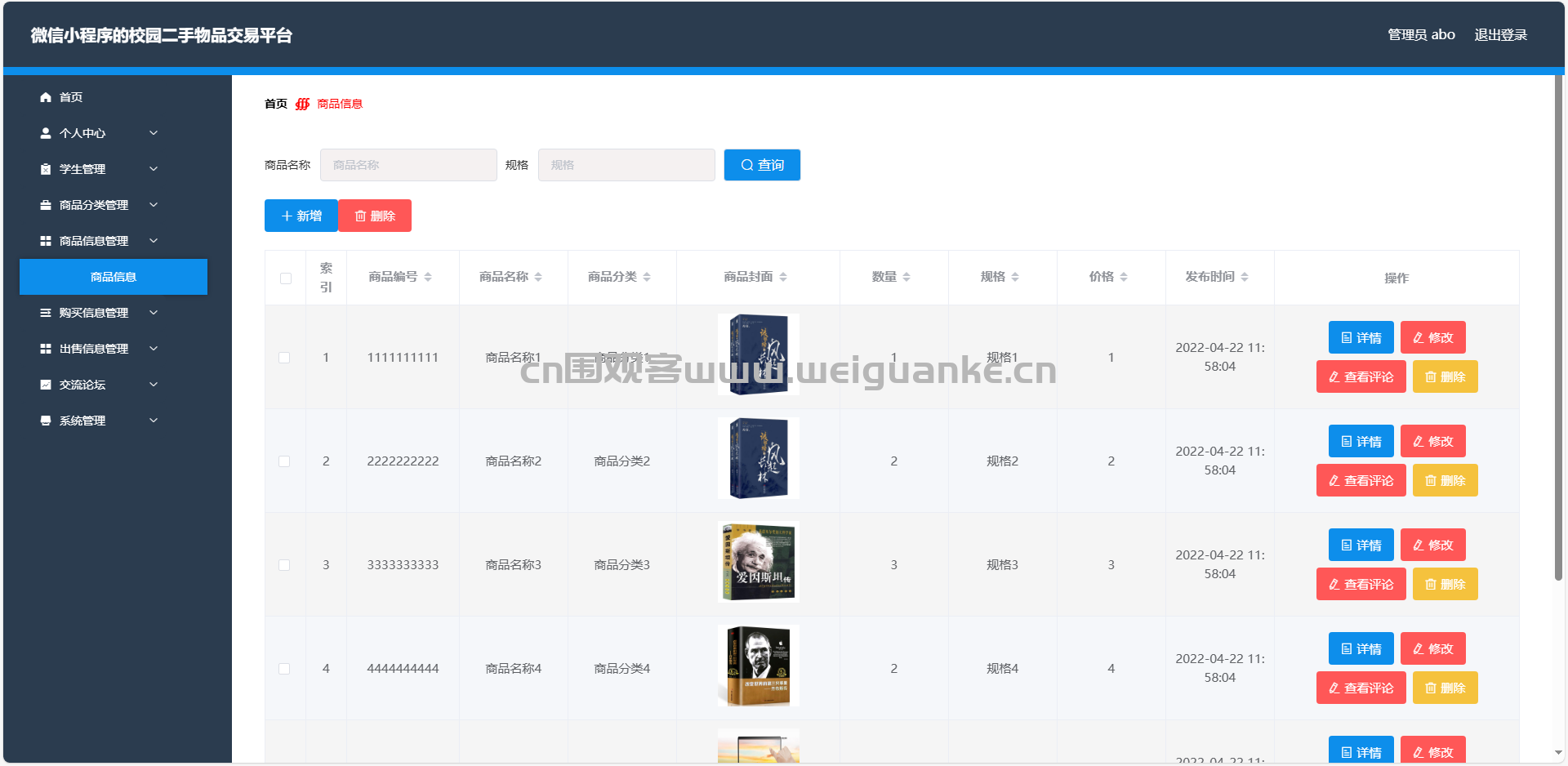 4. 商品信息管理:根据出售信息去添加、编辑、删除商品信息和评论信息