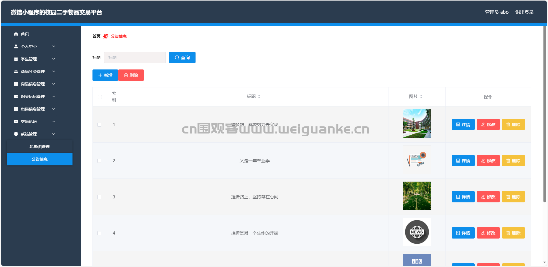 7.公告管理:查看、添加、编辑、删除公告信息