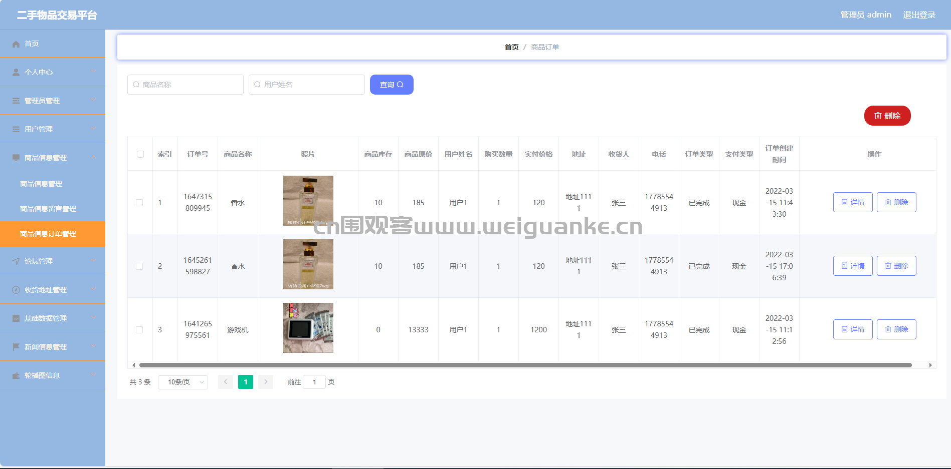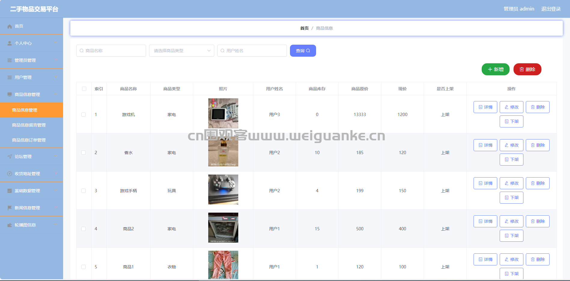 商品信息管理:管理员可以管理商品信息,包括商品信息管理、商品信息留言管理和商品信息订单管理。