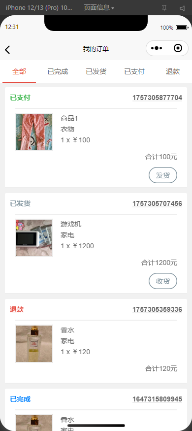 我的订单:用户可以查看自己的订单状态,包括全部订单、已完成订单、已发货订单、已支付订单和退款订单。