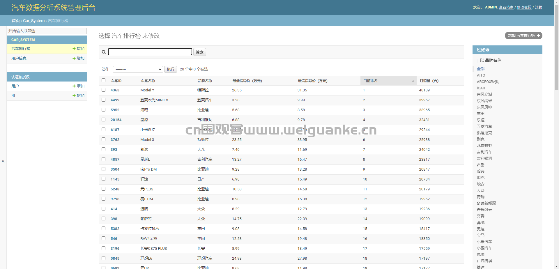 汽车排行榜:查看所有汽车列表的信息。对汽车信息进行管理。