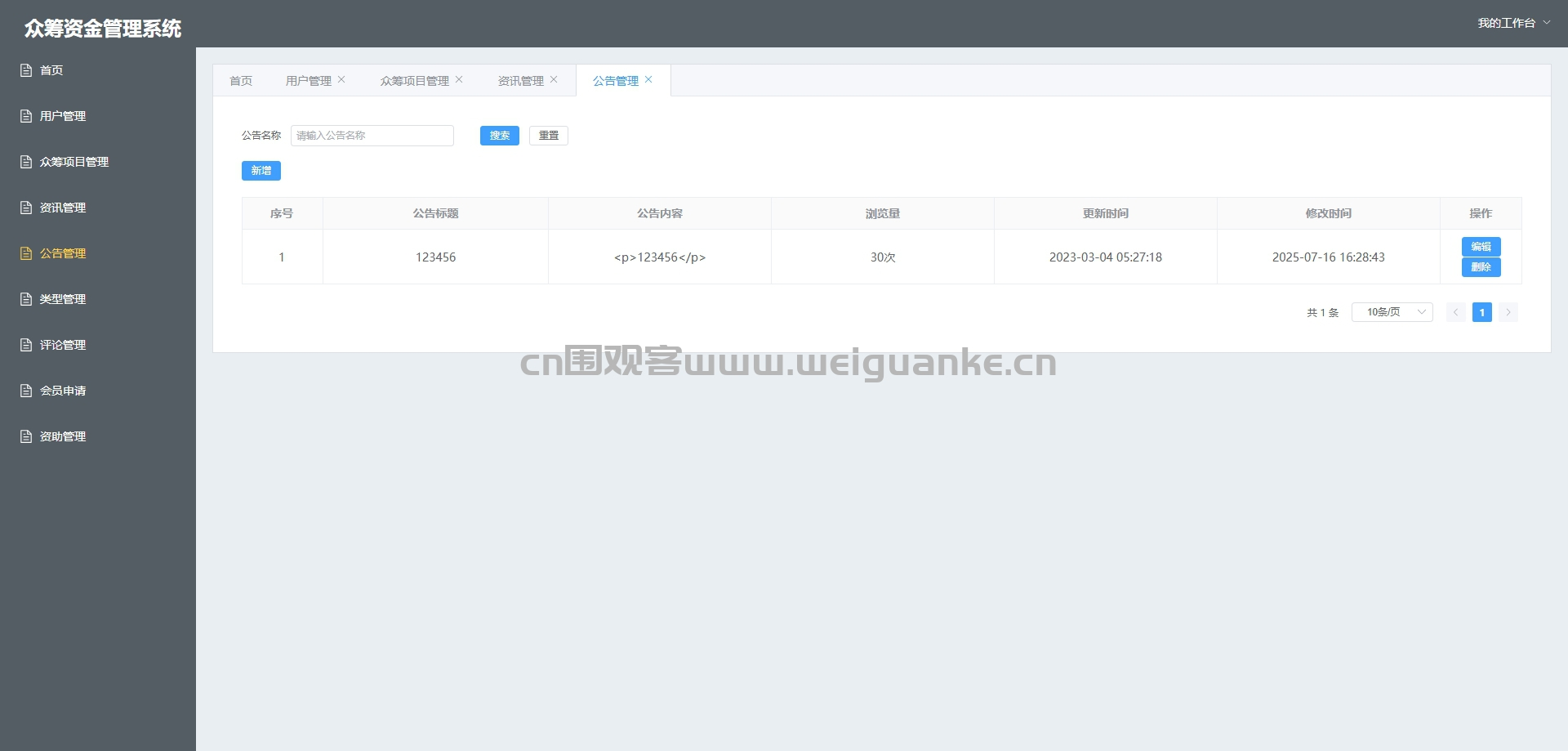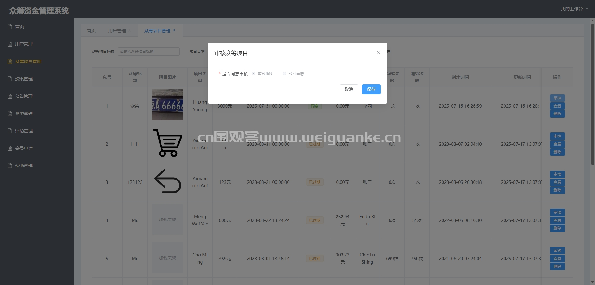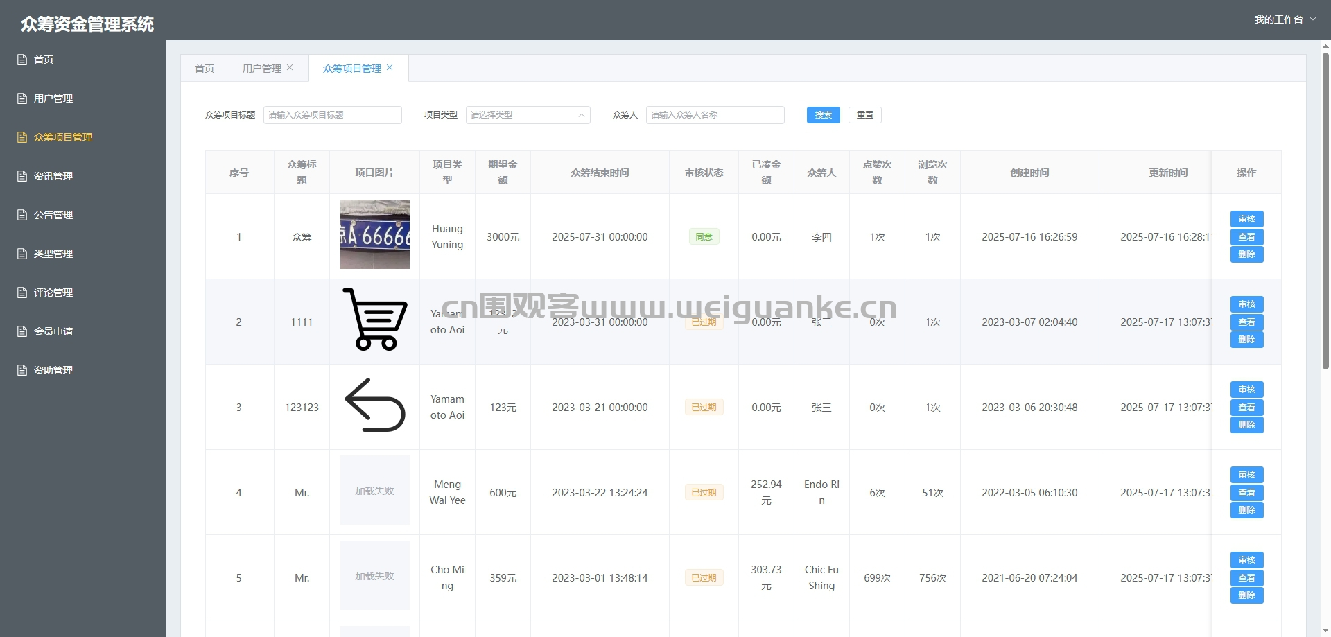 众筹项目管理:管理平台所有众筹项目的审核与运营