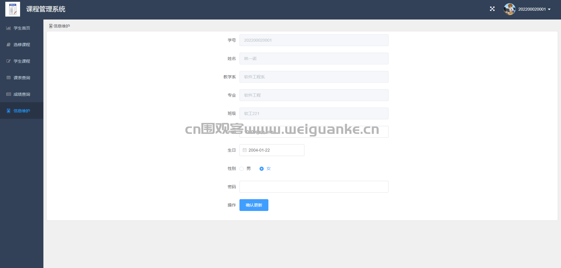信息维护:修改个人信息,如联系方式等。