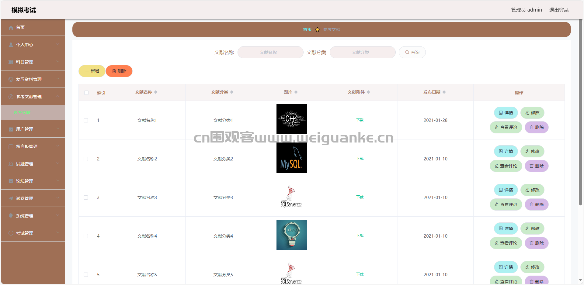 4.复习资料管理:查看、添加、编辑、删除资料信息和评论信息