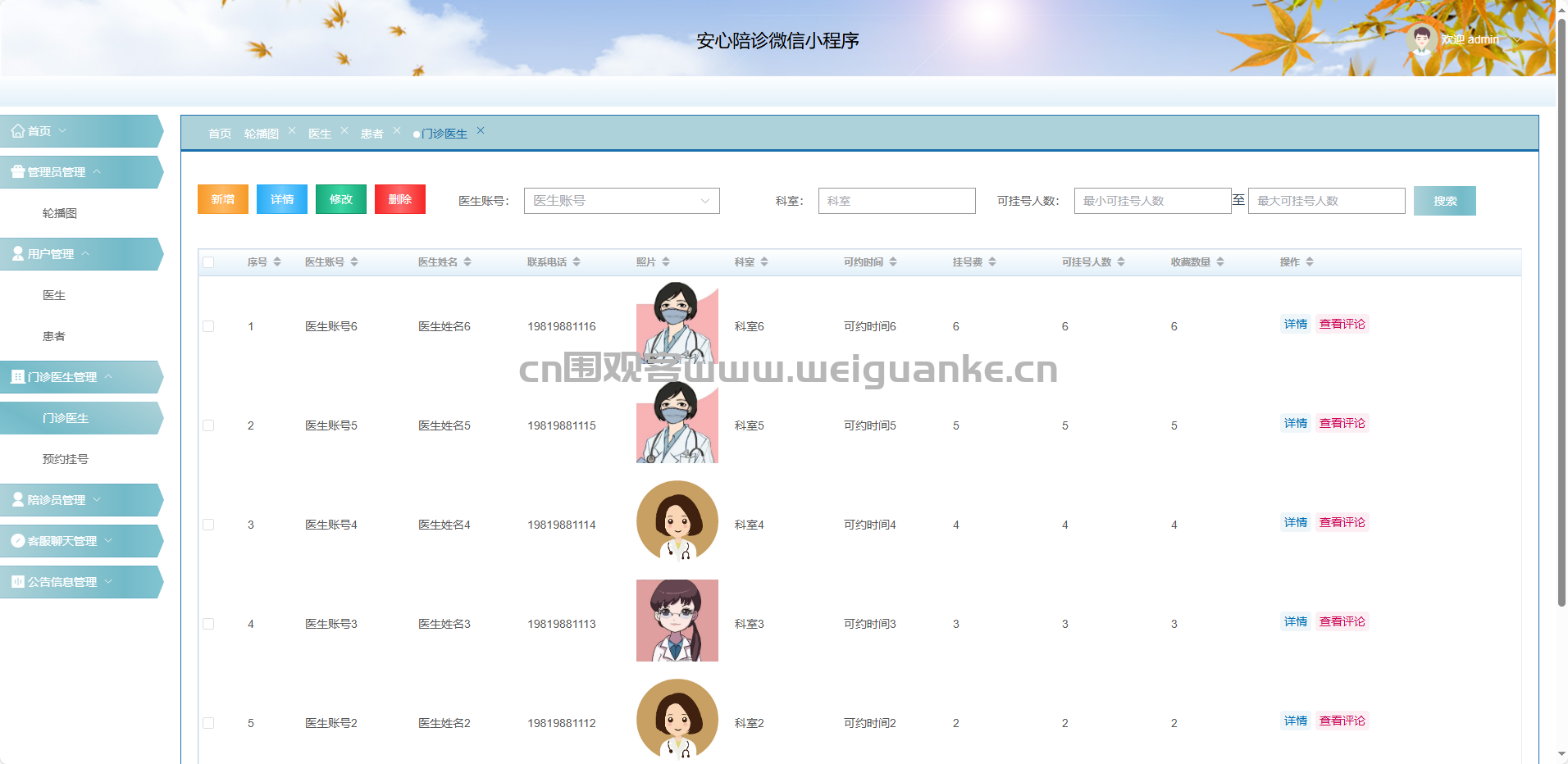 门诊医生:新增、修改、删除、查看医生详情。