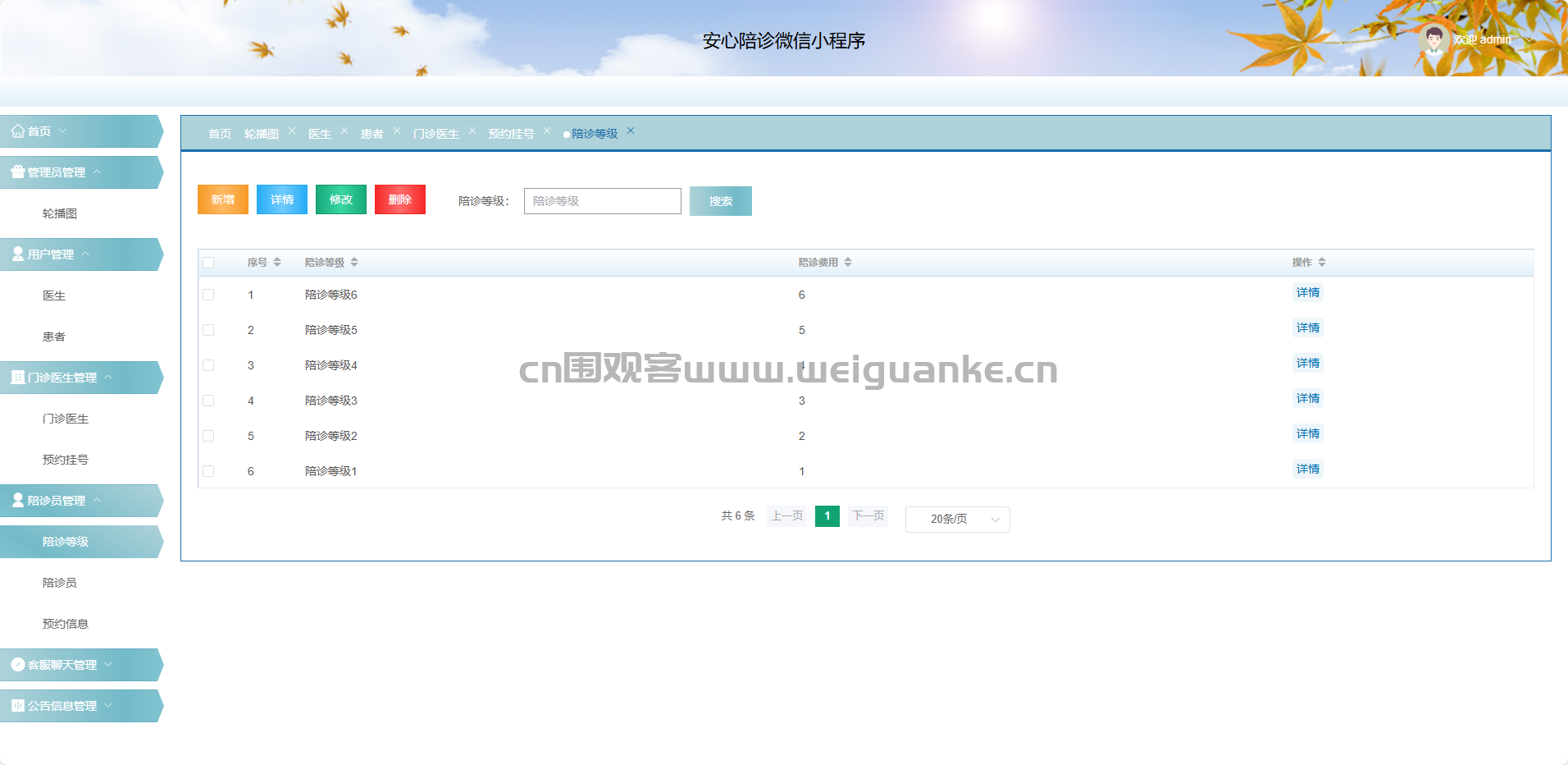 陪诊等级:新增、修改、删除、查看等级标准。