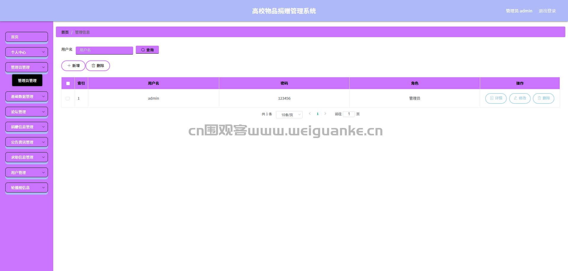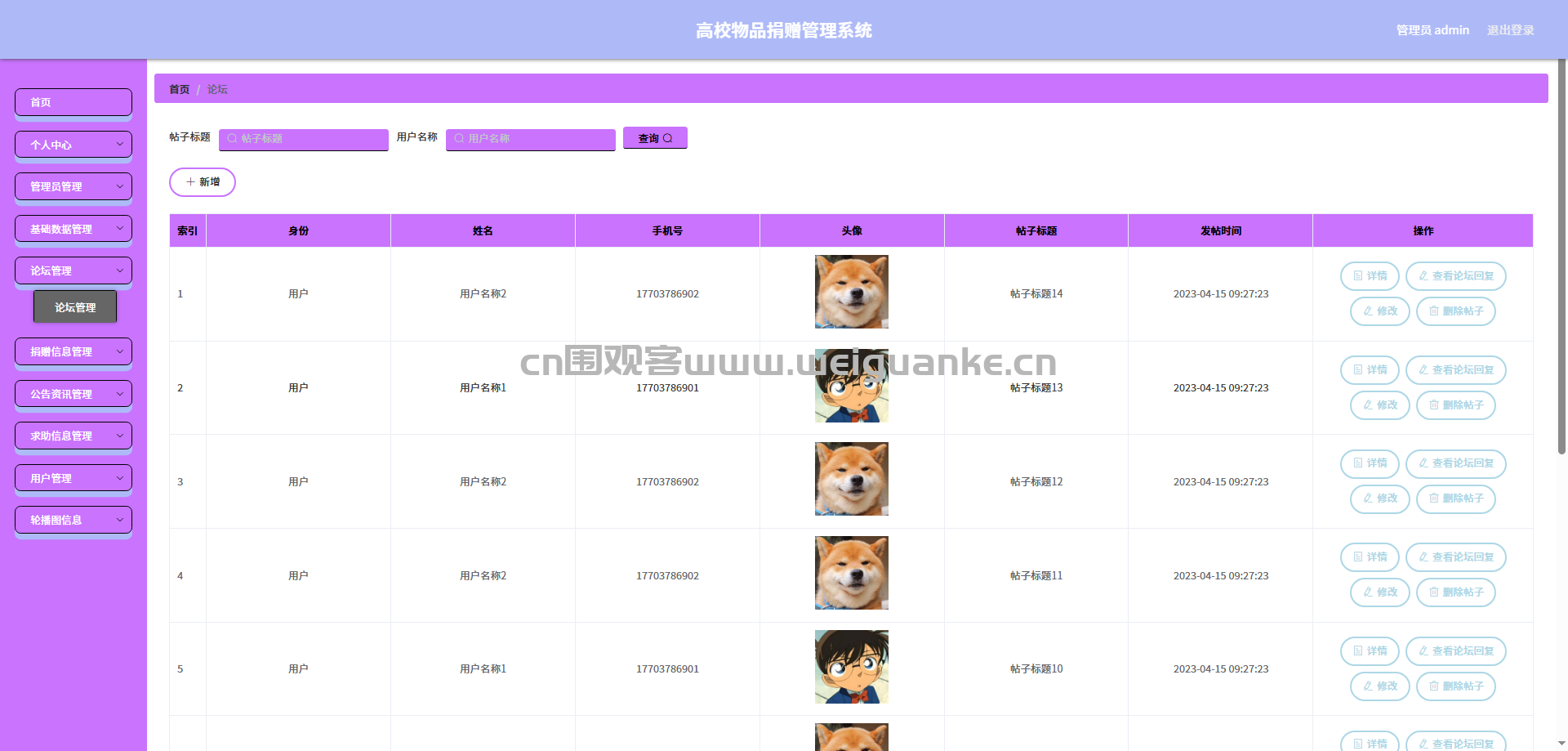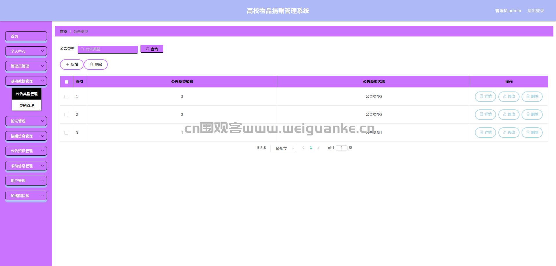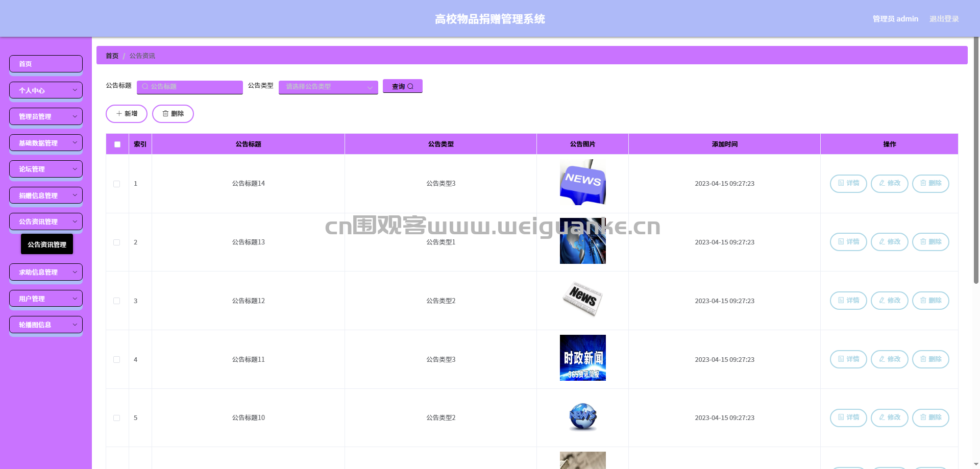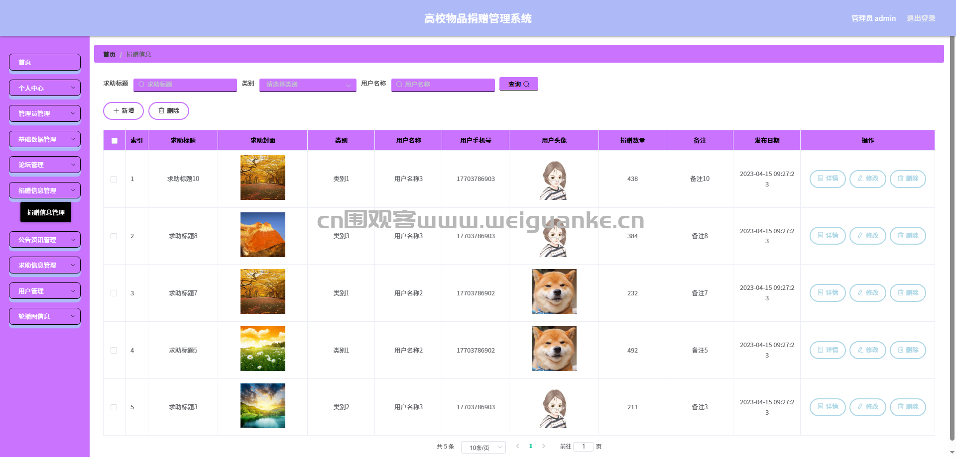 本项目是一个基于Spring Boot后端技术和vue端技术构建的高校物品捐赠系统。该平台旨在为用户提供一个方便快捷的高校物品捐赠环境。整个系统采用RESTful API进行前后端交互,确保数据的安全性和一致性。