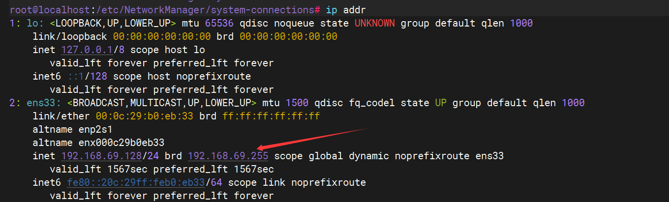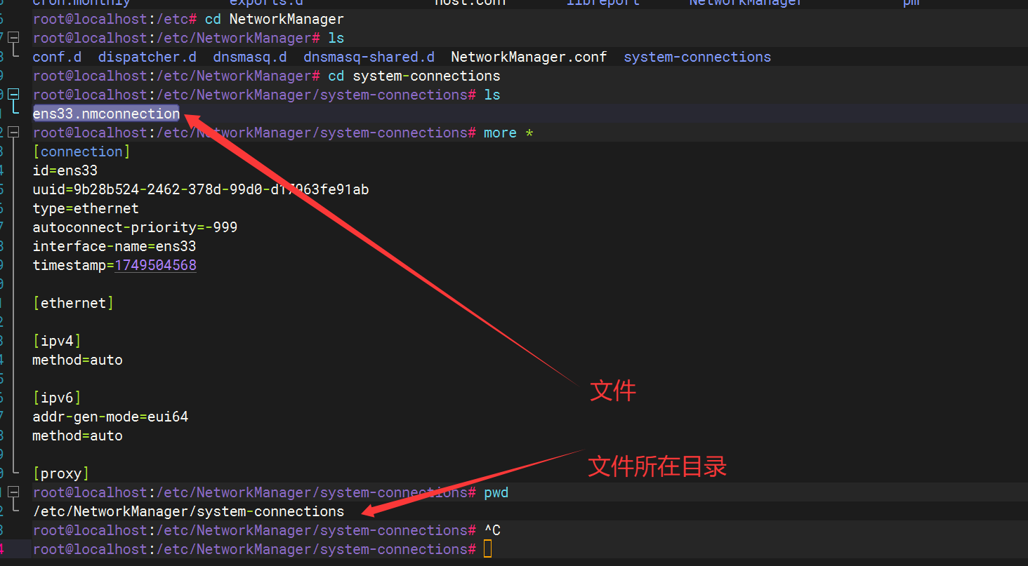 fedora-server42版本的网络配置文件与centos不一样,网络配置文件在/etc/NetworkManager/system-connections目录中的ens33.nmconnection进行配置,默认文件内容如下图所示