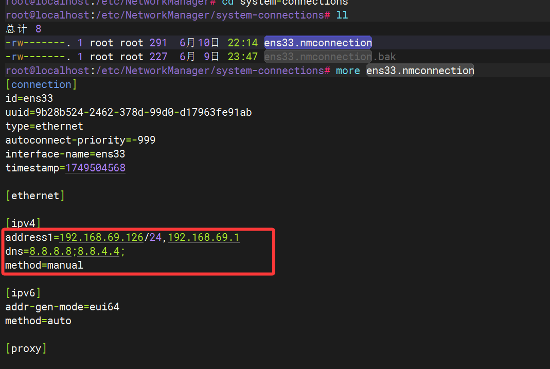 3、在ens33.nmconnection文件中的【ipv4】目录下加入如下内容