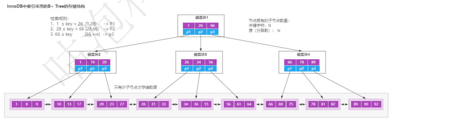 1.B+树所有数据存储在叶子节点,非叶子节点只存储索引;
