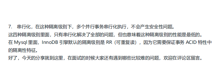 通过强制事务排序,使之不可能相互冲突,从而解决幻读问题。简言之,它是在每个读的数据行上加上共享锁。在这个级别,可能导致大量的超时现象和锁竞争。