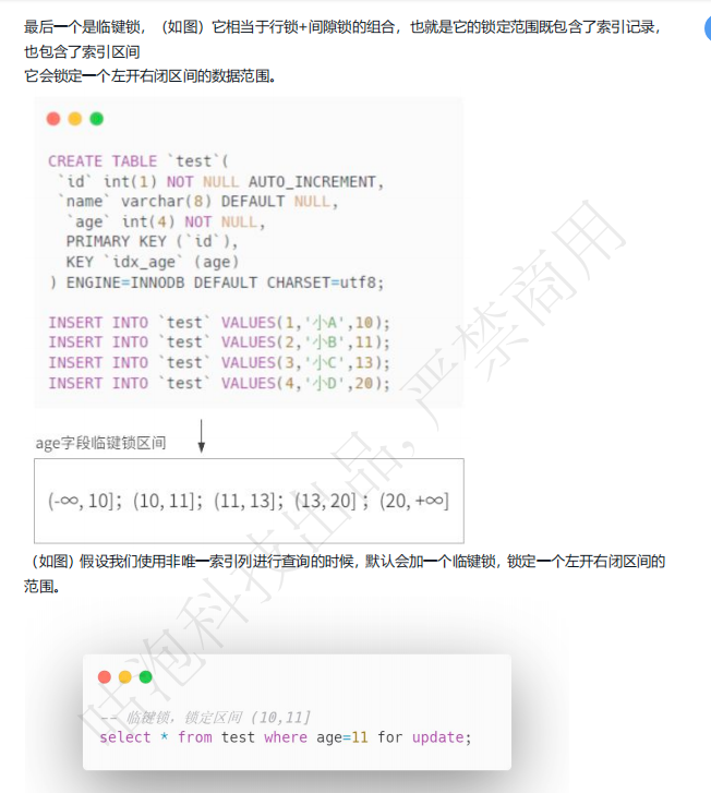 -- 临键锁,锁定区间(10,11] select * from test where age=ll for update;
