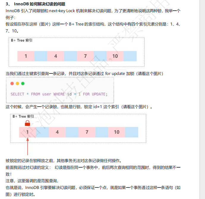 间隙锁:就是锁定一个索引区间。在普通索引或者唯一索引的列上,由于索引基于B+树的一个结构存储。