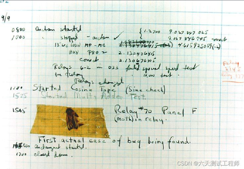 1947年9月9日,赫柏对Harvard Mark II设置好17000个继电器进行编程后,技术人员正在进行整机运行时,它突然停止了工作。于是他们爬上去找原因,发现这台巨大的计算机内部一组继电器的触点之间有一只飞蛾,这显然是由于飞蛾受光和热的吸引,飞到了触点上,然后被高电压击死。所以在报告中,赫柏用胶条贴上飞蛾,并把“bug”来表示“一个在电脑程序里的错误”,“Bug”这个说法一直沿用到今天。——百度百科