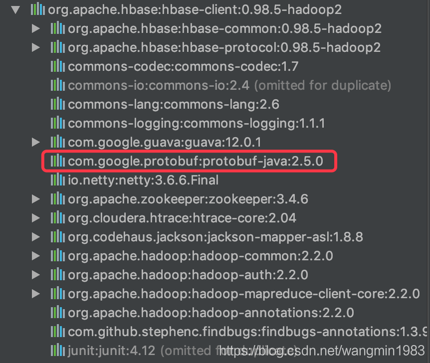 在实际生产环境往往已经安装了某个版本的HBase,由于HBase的Client和Server之间采用protobuf协议,所以在实际动手之前我们先找一下和实际HBase版本想匹配的protobuf的版本号。由于本人用的是HBase的CDH版本,版本号为1.2.0-cdh5.14.2。所以我将HBase的hbase-client和hbase-server引入我的Intellij中,并打开依赖树找到依赖的protobuf版本号为2.5.0,如下图: