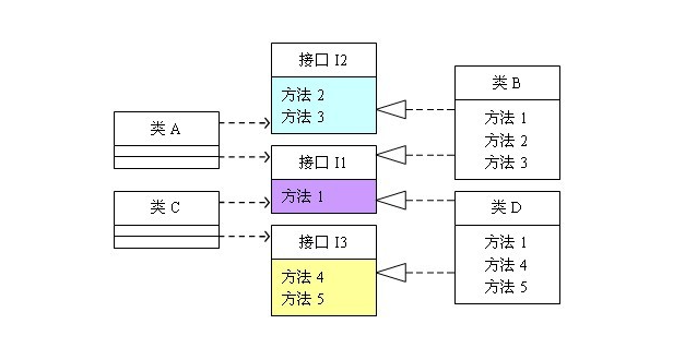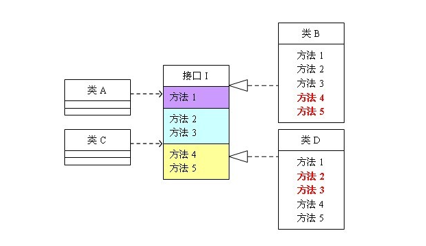 这个图的意思是:类A依赖接口I中的方法1、方法2、方法3,类B是对类A依赖的实现。类C依赖接口I中的方法1、方法4、方法5,类D是对类C依赖的实现。对于类B和类D来说,虽然他们都存在着用不到的方法(也就是图中红色字体标记的方法),但由于实现了接口I,所以也必须要实现这些用不到的方法。对类图不熟悉的可以参照程序代码来理解,代码如下: