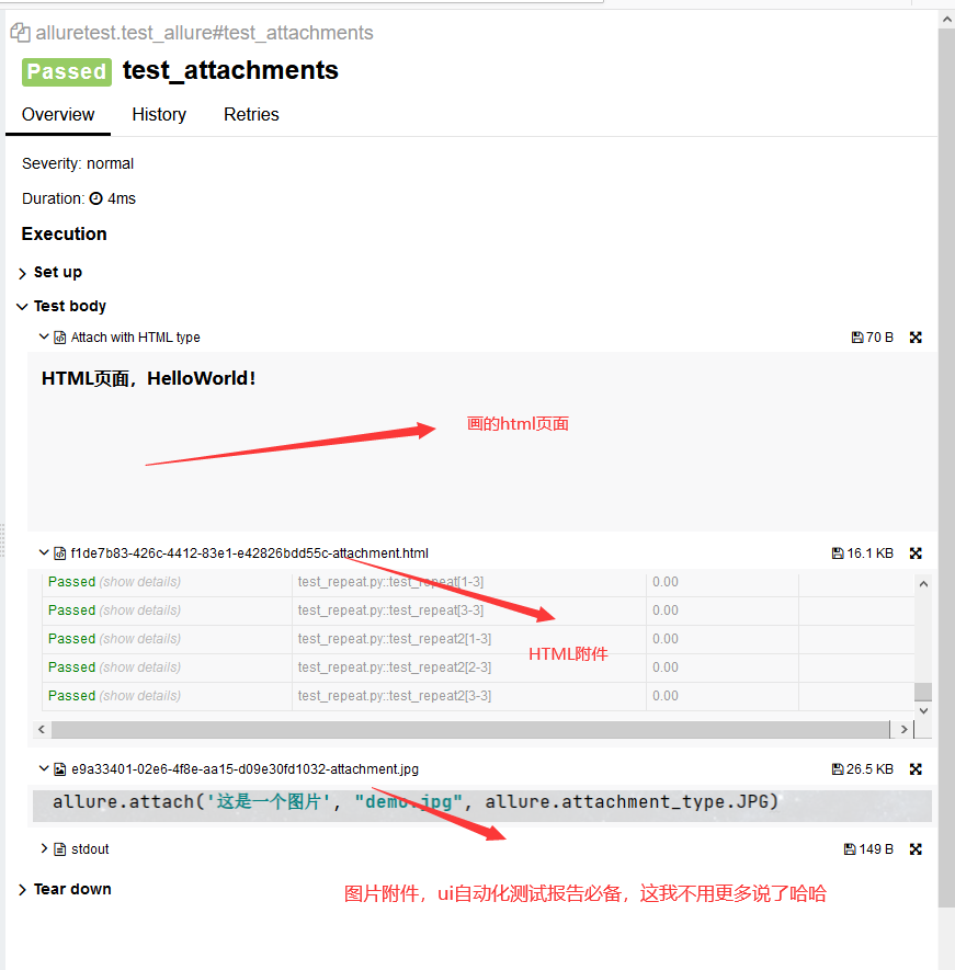 allure.attach('<head></head><body><strong>HTML页面,HelloWorld!</strong> </body>', 'Attach with HTML type',