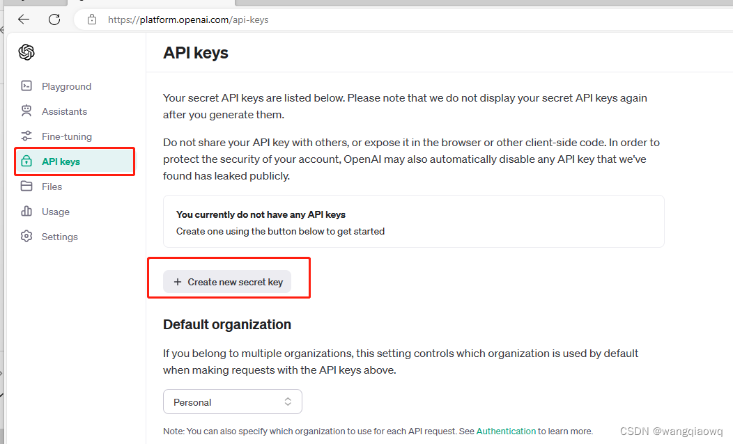 - 创建API密钥:注册账号后,需要创建API密钥,这个密钥是调用OpenAI API所必需的。在OpenAI账号设置页面中可以创建API密钥,并将其保存好。