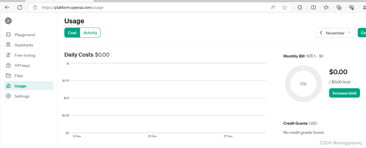这里可以查看API的使用情况,新账号注册默认有5美元的试用额度