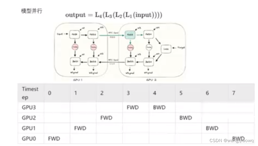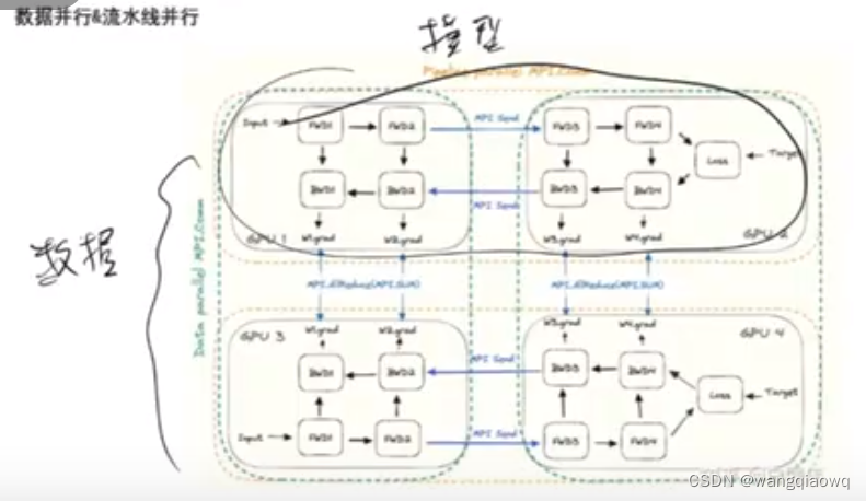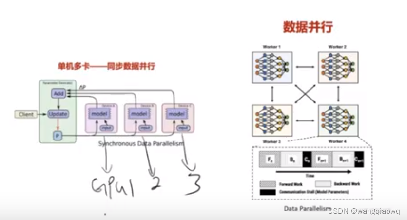 - 为了保持整个模型的一致性,在每次参数更新之前,各个计算单元需要通过某种形式的通信机制(例如点对点通信、AllReduce操作等)来合并各自计算出的梯度。