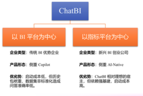 一条路径是以 BI 平台为核心,许多拥有传统 BI 优势的企业倾向于采用这种方式。他们侧重 Copilot,以 BI 平台为起点,构建和运用 ChatBI。这一路径的启动成本相对较低,BI 平台背后已有成型的数据集,这些数据集可直接用于提问和初步分析。然而,这一路径也面临着一定的历史遗留问题。因为这些数据集并非专为提问和终端消费者而构建,而是主要服务于报表制作人员。因此,数据集的非标准化可能导致问答的准确率相对较低。