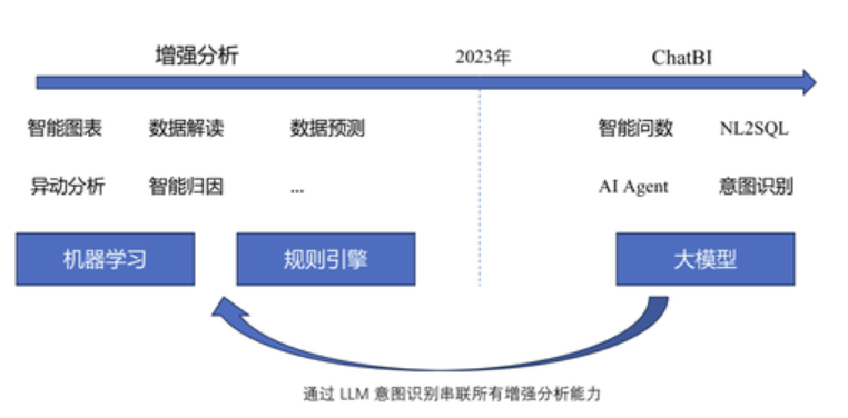 通过 LLM 大模型的意图识别能力,将以往的增强分析功能都串联了起来,用户现在可以通过自然语言进行数据的解读、预测和异动分析。