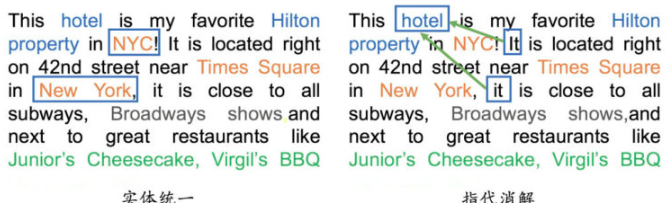 指代消解,也是文本中出现的“it”, “he”, “she”这些词到底指向哪个实体,指代消解总的来说是为了避免代词指代不清的情况。