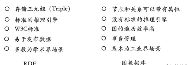主要数据模型有RDF图和属性图两种,形成了RDF数据的三元组库和属性图的图数据库。一种是基于 RDF 的存储;另一种是基于图数据库的存储。它们之间的区别如下图所示。RDF 一个重要的设计原则是数据的易发布以及共享,图数据库则把重点放在了高效的图查询和搜索上。RDF 以三元组的方式来存储数据而且不包含属性信息,但图数据库一般以属性图为基本的表示形式,所以实体和关系可以包含属性,这就意味着更容易表达现实的业务场景。