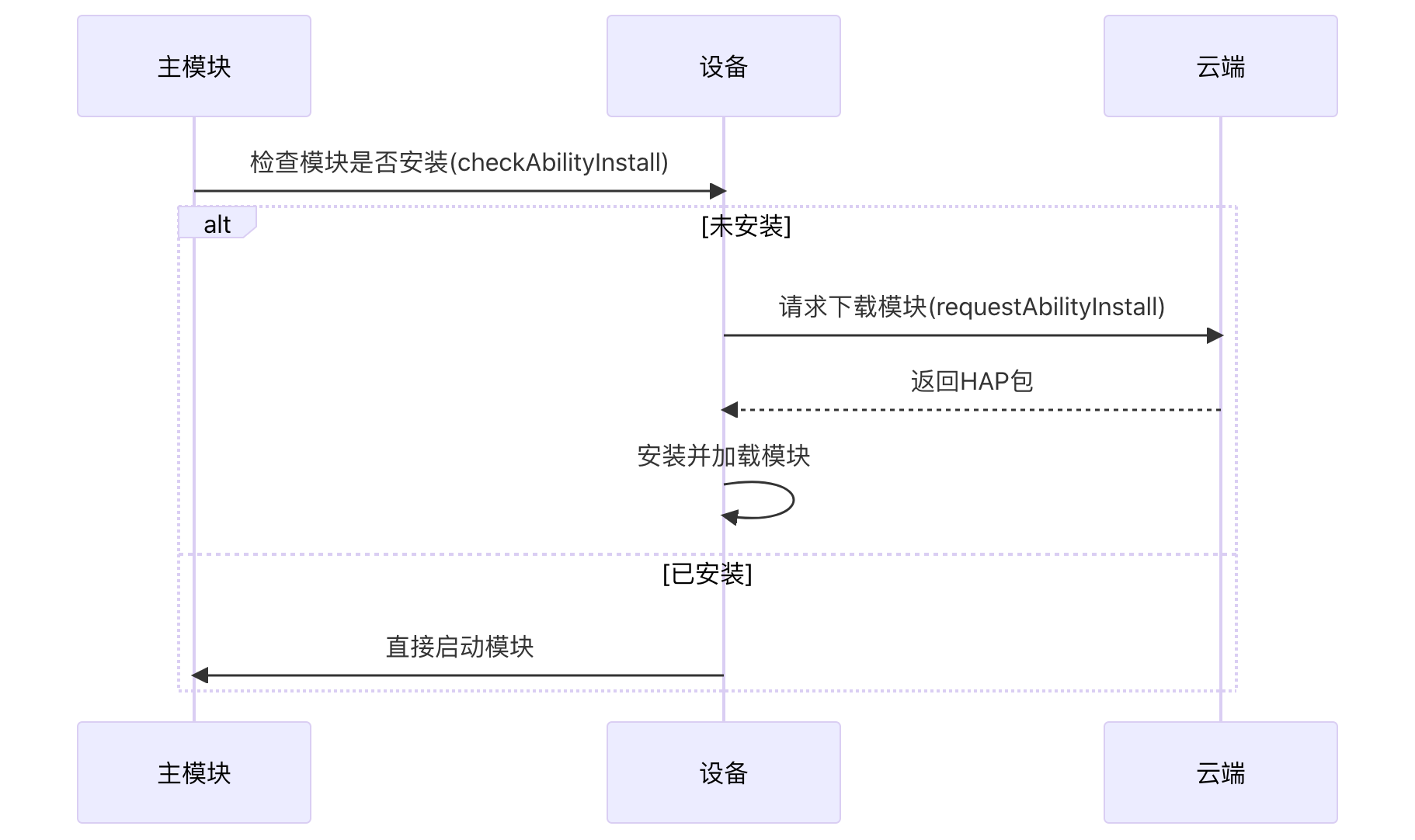 checkAbilityInstall:验证模块是否已安装。requestAbilityInstall:触发下载安装(需配置AGC云控) 。