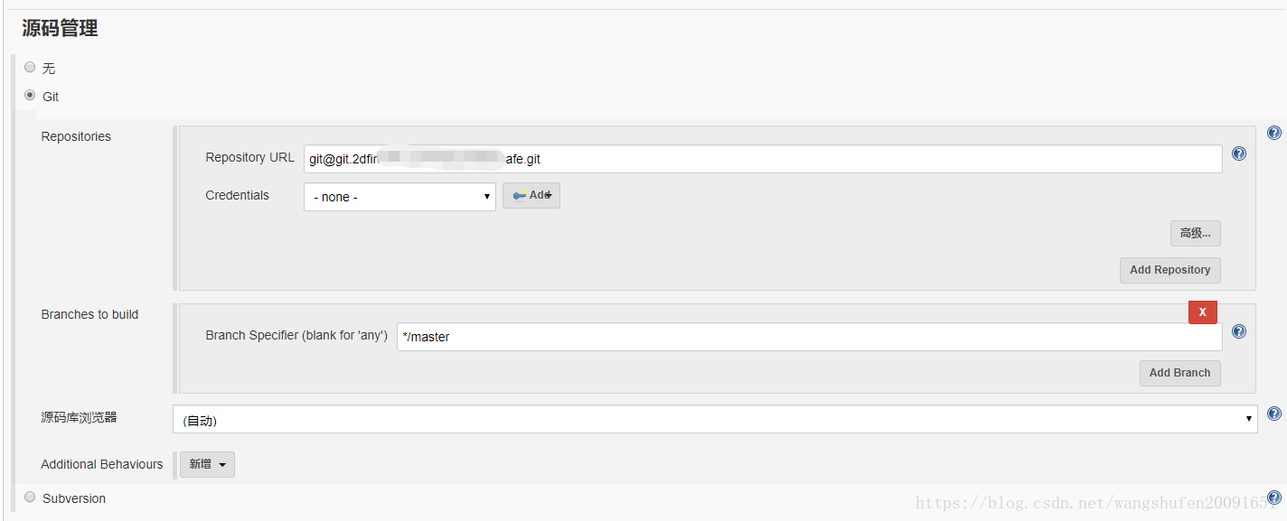 向下滚动到“ 源代码管理”部分并选择Git,然后指定存储库URL及分支