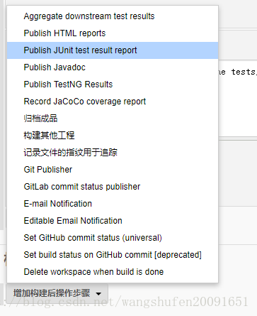 转到“构建后操作”部分,然后单击“ 添加构建后操作”。在下拉列表中,选择“ 发布JUnit测试结果报告”。