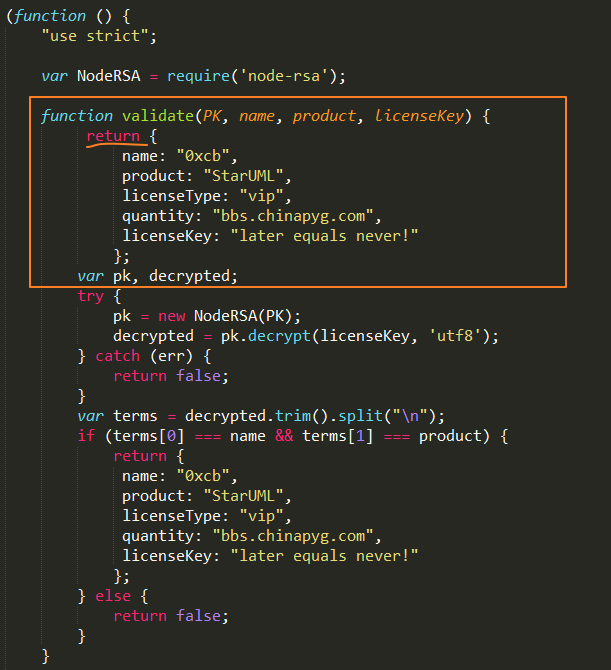 StarUML 是一款收费软件,但它的破解很有意思。在安装 StarUML 的 www/license/node 目录下,找到 LicenseManagerDomain.js,在校验函数中直接返回用户信息即可。