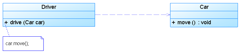 依赖关系(Dependency)是一种使用关系,特定事物的改变有可能会影响到使用该事物的其他事物,在需要表示一个事物使用另一个事物时使用依赖关系。大多数情况下,依赖关系体现在某个类的方法使用另一个类的对象作为参数。