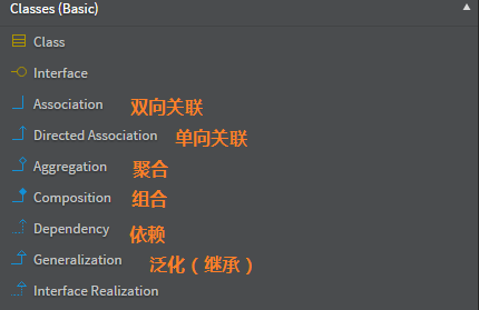 在绘制类之间的关系时,对应 UML 的工具如下图所示: