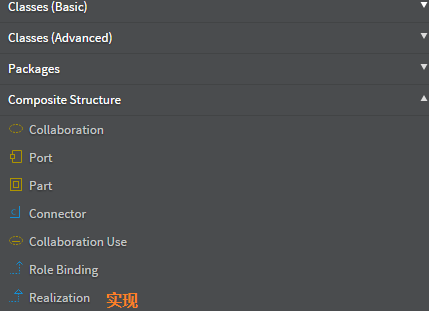其中实现的关系,要达到带空心三角形的虚线表示,则不要使用这个 Interface Realization,而应该在 Composite Structure 目录下找到 Realization 的工具。